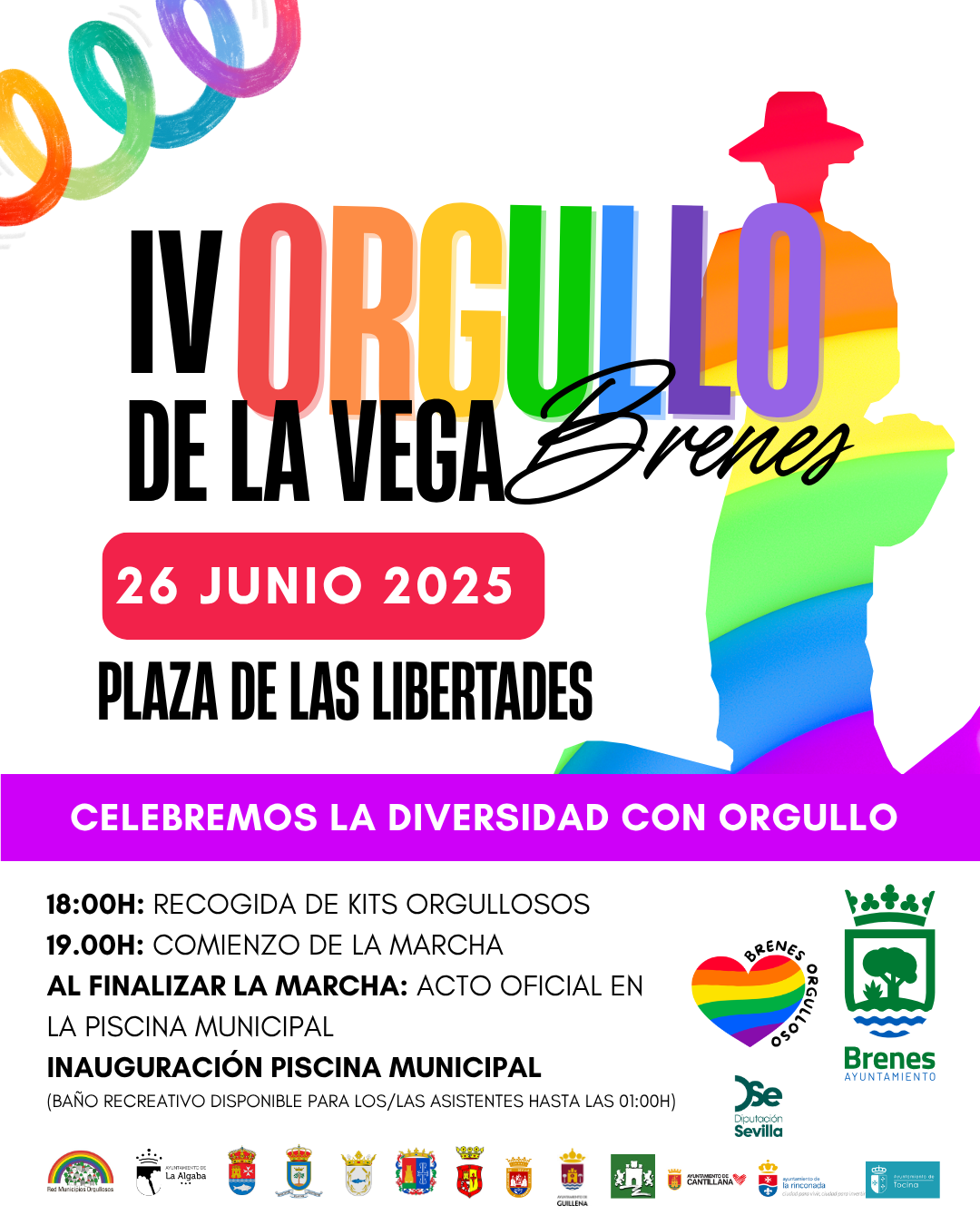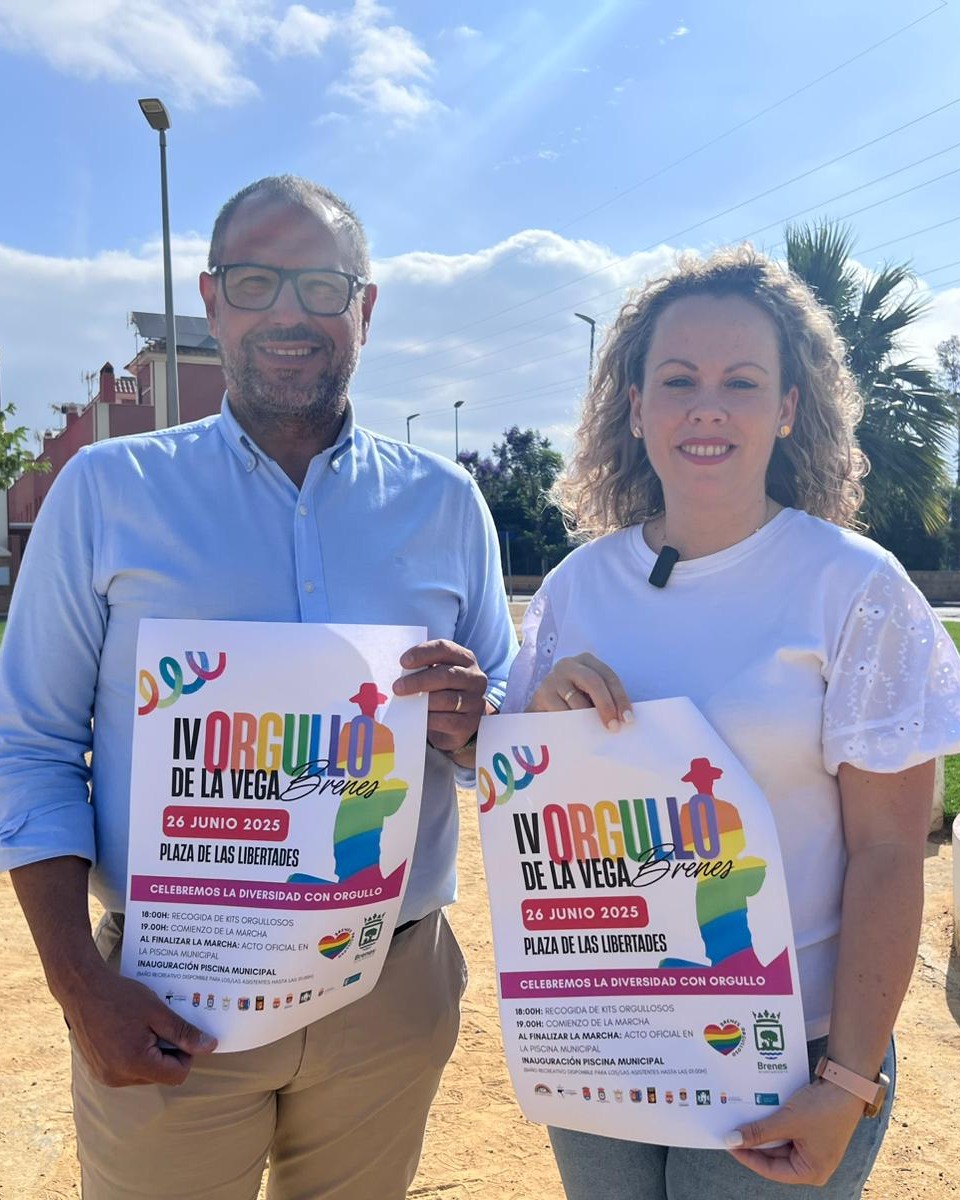 Bajo el lema “Celebremos la diversidad con orgullo”, Brenes, como miembro de la Red de Municipios Orgullosos, acogerá una jornada llena de color, reivindicación y convivencia, que culminará con la inauguración de la piscina municipal y un baño recreativo para todas las personas asistentes.