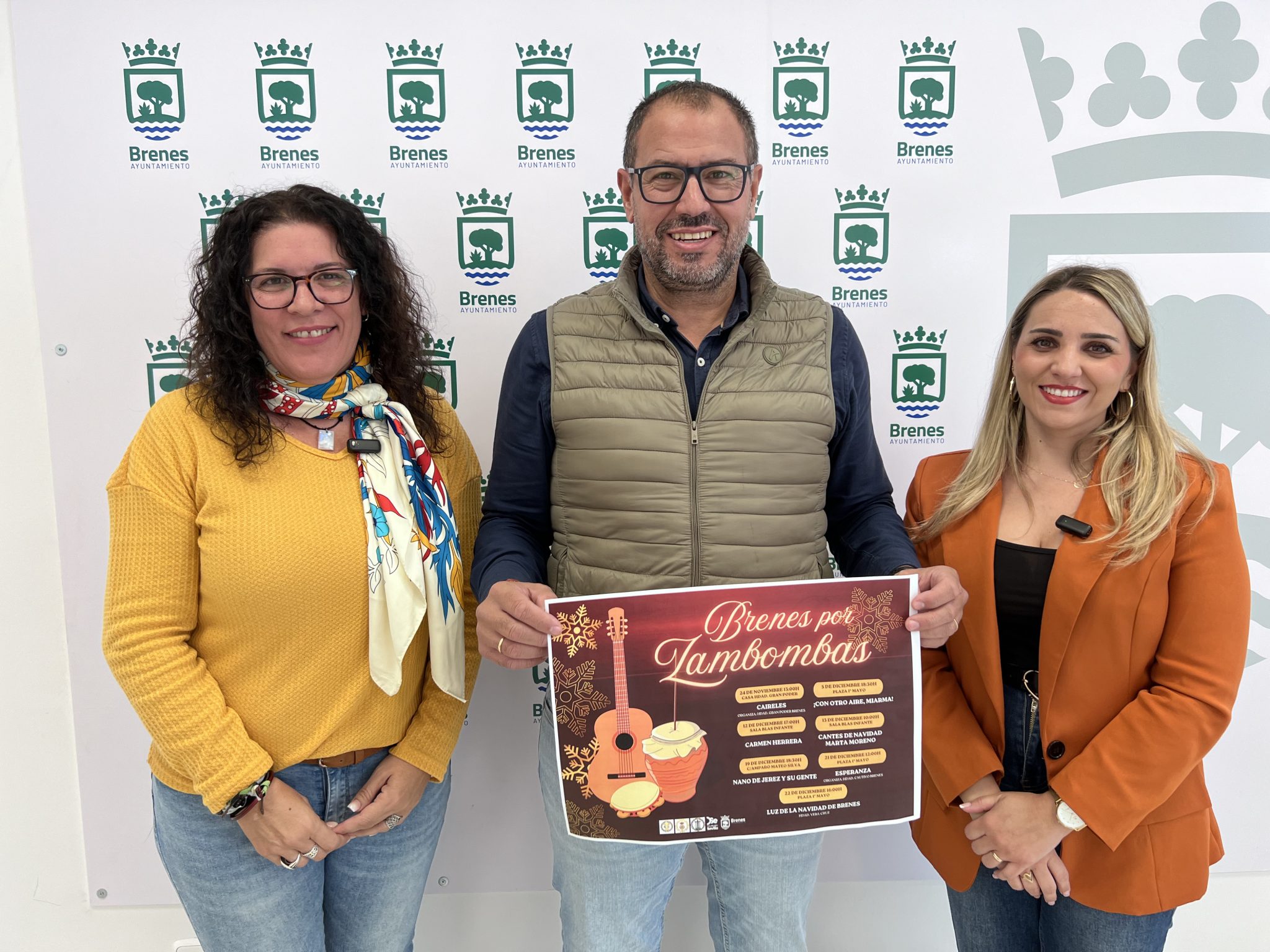 El alcalde de Brenes, Jorge Barrera, junto con la concejala de Cultura, Reme Gil, y la concejala de Fiestas Mayores, Cristina Calle, presentan “Brenes por Zambombas”, una de las grandes apuestas culturales de esta Navidad.